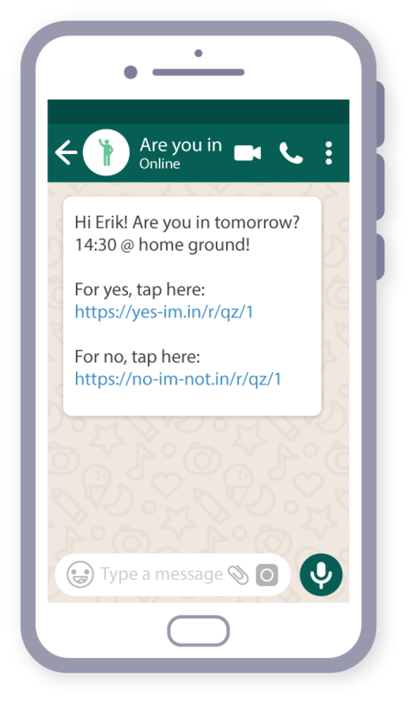 During the initial release of "Are you in", the WhatsApp Business API had not yet been officially released. For this reason, the initial version uses SMS instead of Whatsapp to ask team players about their attendance.