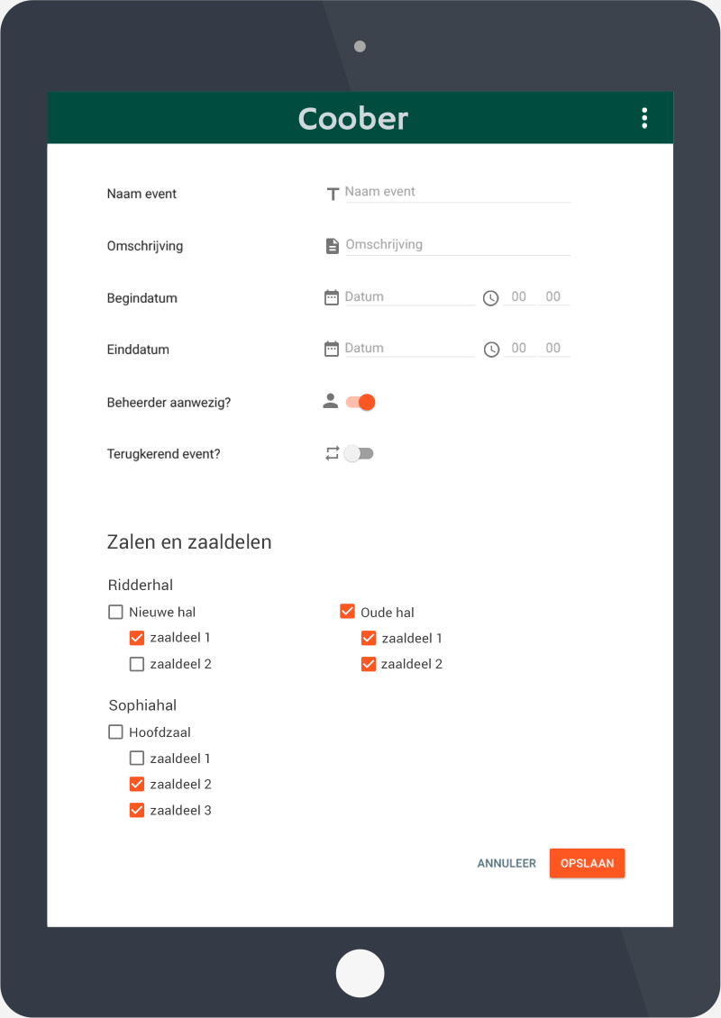 Coober admin is a web app built in ES6 with AngularJS and Google Material Design. It's first main feature focused on managing the availability of sports halls connected to Coober. In the future we may extend Coober admin with other features, such as the capability to manage orders and edit sports hall profile pages.