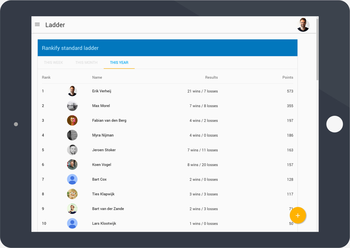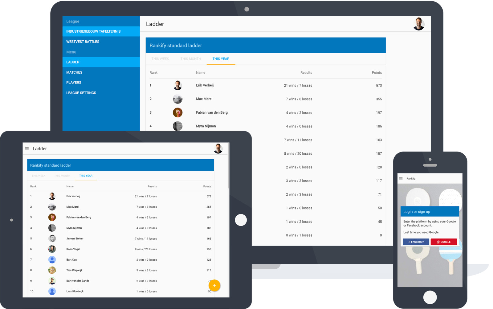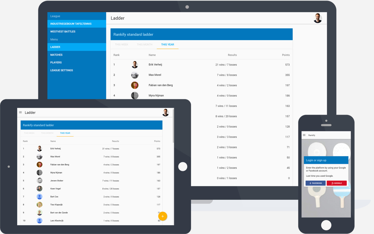 Originally, Rankify was developed to create a table tennis ladder, but now it can be used to keep track of any 1-vs-1 sports games, board games or computer games.